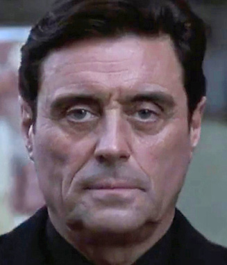 An attractive formal MAN in Brioni wool trenchcoat and dark blackish hair walks casual and relaxed toward a White House exterior guard post. The Man is a precise duplicate of actor Ian McShane at age 57, from McShane’s year 2000 role in the movie SEXY BEAST. Same stark and almost frightening face with electric grey eyes and occasionally gentle smile.